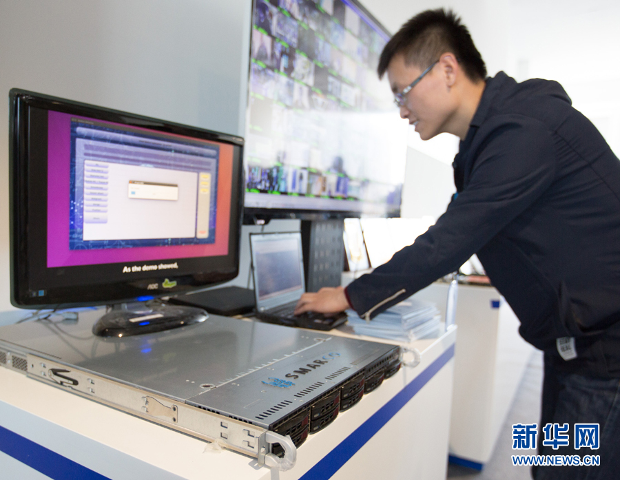 在北京智能計算產(chǎn)業(yè)研究院舉行的發(fā)布會上,工作人員在現(xiàn)場演示高通量人工智能一體機(jī)的實際應(yīng)用(2017年12月6日攝)。新華社記者 金立旺 攝