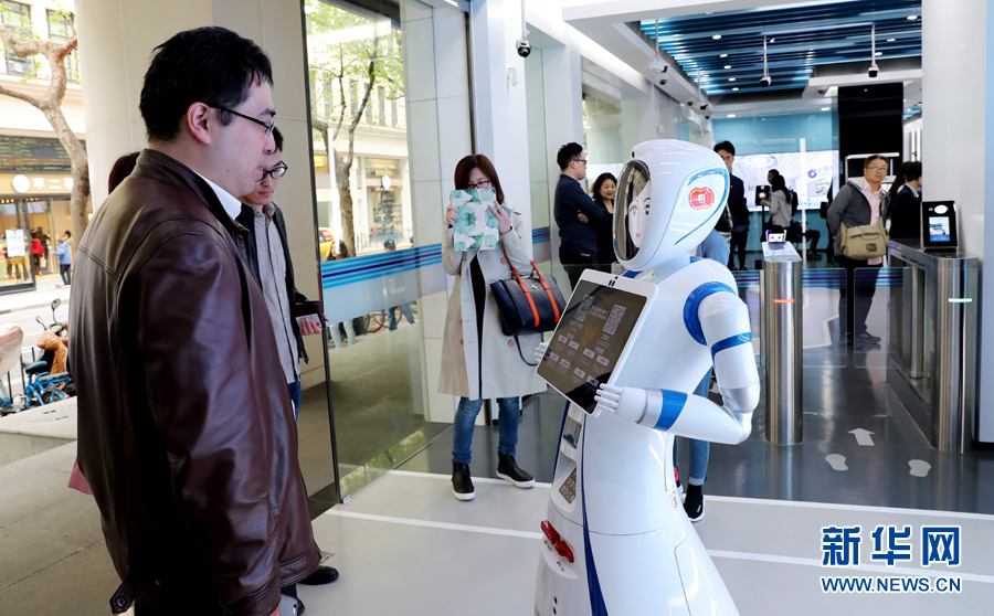 一位市民在位于上海九江路的無人銀行入口處向迎賓機(jī)器人說明需要辦理的業(yè)務(wù)種類(4月12日攝)。近日,中國建設(shè)銀行在上海九江路開出國內(nèi)首家無人銀行。新華社記者 方喆 攝