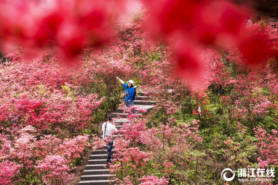 4月21日,全國森林旅游示范縣、浙中杜鵑谷——磐安縣盤峰鄉(xiāng)高姥山核心區(qū)塊的2000多畝各色杜鵑競相爭艷,滿山遍野杜鵑姿態(tài)萬千,花團(tuán)錦簇,身臨其中,宛如置身仙境。(浙江在線拍友 陳溢之 攝)