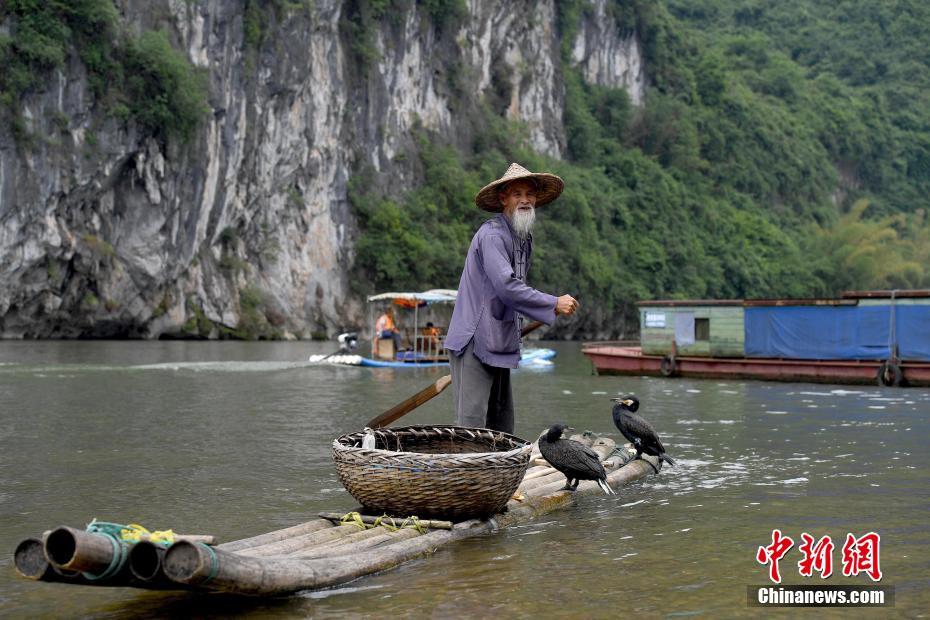 79歲的黃月創(chuàng)正在表演漓江傳統(tǒng)漁事。中新社記者 俞靖 攝