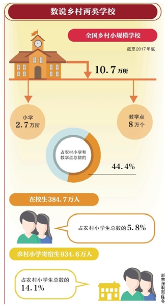 數(shù)據(jù)顯示,截至2017年底,全國有鄉(xiāng)村小規(guī)模學(xué)校(指不足100人的村小學(xué)和教學(xué)點)10.7萬所,占農(nóng)村小學(xué)和教學(xué)點總數(shù)的44.4%;在校生384.7萬人,占農(nóng)村小學(xué)生總數(shù)的5.8%。農(nóng)村小學(xué)寄宿生934.6萬人,占農(nóng)村小學(xué)生總數(shù)的14.1%。