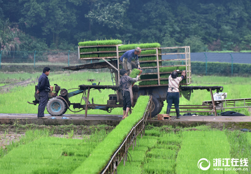 武義縣一育秧工廠員工忙著為訂單農(nóng)戶起運(yùn)單季稻秧苗。