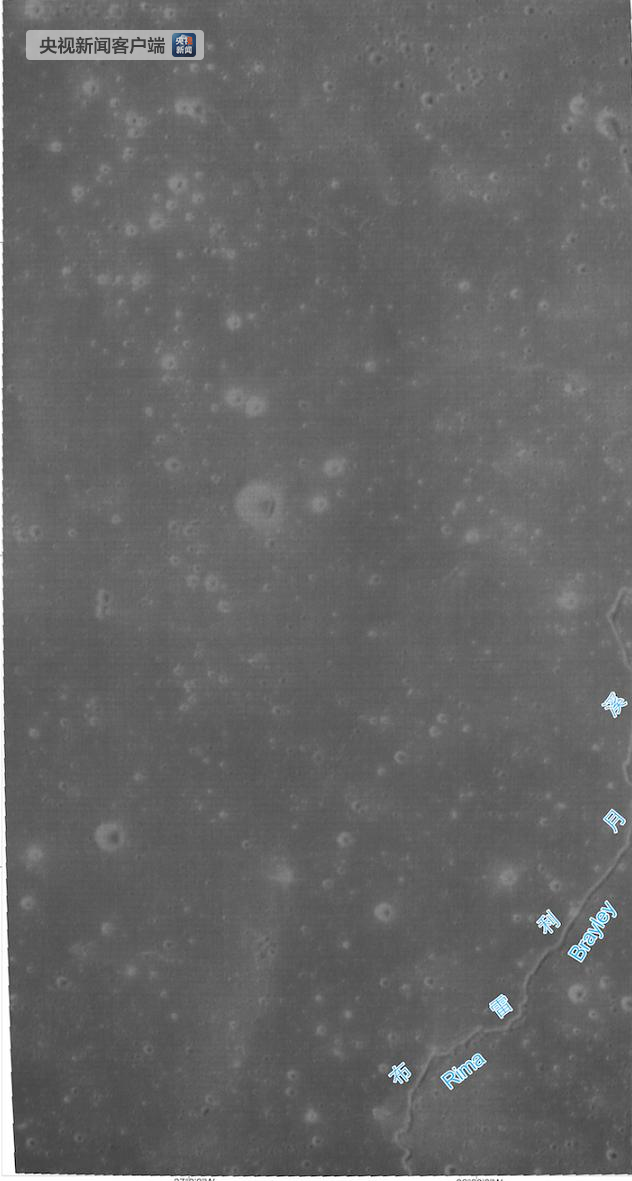 ?。ㄓ跋駡D位于雨海西南部,寬約30.5千米,長約57.1千米。該區(qū)域表面較平坦,分布有小型環(huán)形坑,其中最大的環(huán)形坑直徑約1.9千米。影像圖右下角較為明顯的月貌特征為布雷利月溪的局部,在影像圖中的長度約為36.2千米)