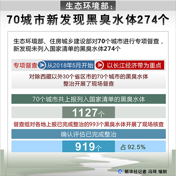 在生態(tài)環(huán)境部當(dāng)天舉行的新聞發(fā)布會(huì)上,張波說(shuō),專(zhuān)項(xiàng)督查從今年5月開(kāi)始,以長(zhǎng)江經(jīng)濟(jì)帶為重點(diǎn),對(duì)除西藏以外30個(gè)省區(qū)市的70個(gè)城市的黑臭水體整治開(kāi)展了現(xiàn)場(chǎng)督查。70個(gè)城市共上報(bào)列入國(guó)家清單的黑臭水體1127個(gè)。督查組對(duì)各地上報(bào)已完成整治的993個(gè)黑臭水體開(kāi)展了現(xiàn)場(chǎng)核查,確認(rèn)評(píng)估已完成整治919個(gè),占92.5%。但與此同時(shí),督查還發(fā)現(xiàn)未列入清單的黑臭水體274個(gè)?!氨欢讲槌鞘泻诔羲w完成比例統(tǒng)算起來(lái)比例就不高了?!?/p>