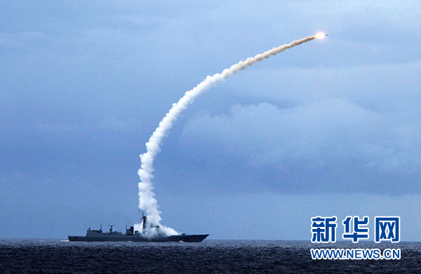 海口艦在實彈演習中發(fā)射艦空導彈攔截來襲目標(2010年7月26日攝)。 新華社發(fā)