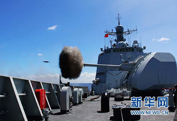 在多國聯(lián)演任務中,??谂炦M行主炮射擊(2014年6月19日攝)。 新華社發(fā)(于林 攝)