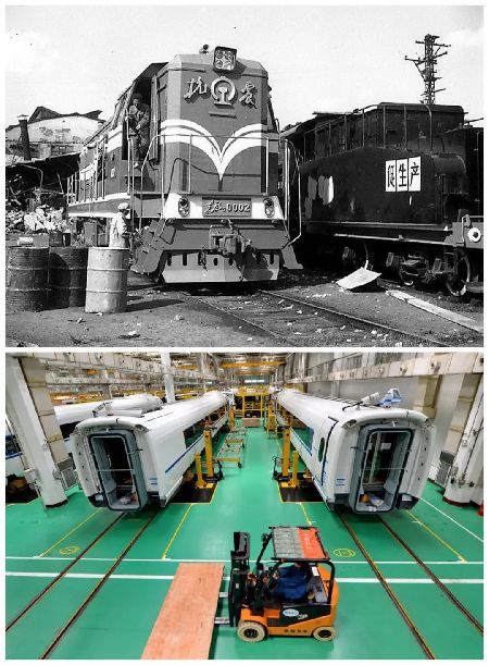 拼版照片:上圖:抗震號機車(資料圖片);下圖:2016年7月22日拍攝的中車唐山公司總裝車間一角(新華社記者 牟宇 攝)。
