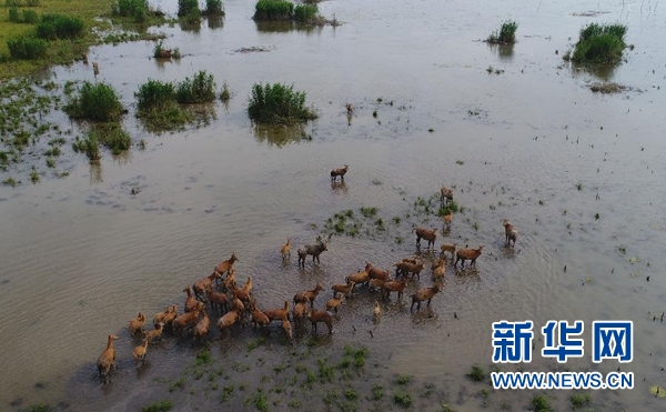 一群自然野化的麋鹿在湖南東洞庭國家級自然保護(hù)區(qū)內(nèi)活動(dòng)(2017年5月10日無人機(jī)拍攝)。 新華社記者 李尕 攝