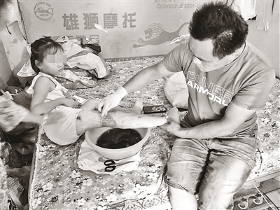 欣欣側(cè)身坐臥在床上,戴著塑膠手套的張志成正在為女兒換藥。右腿膝蓋后窩處的傷口面積很大,夏天化膿尤為嚴重,平常清洗創(chuàng)面、換藥這些事對張志成來說已經(jīng)輕車熟路了。懂事的欣欣沒有哭鬧,也沒有喊疼。