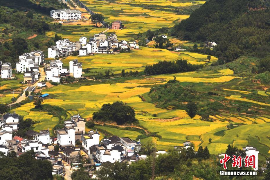 9月13日,在“中國(guó)最美鄉(xiāng)村”的江西婺源縣,正值收獲期的金黃水稻與周邊建筑構(gòu)成了一幅美好的田園豐收?qǐng)D卷。中新社發(fā) 曹加祥 攝