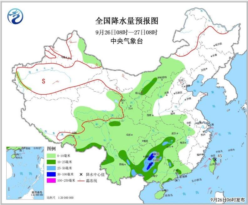 圖1 全國降水量預(yù)報圖(9月26日08時-27日08時)