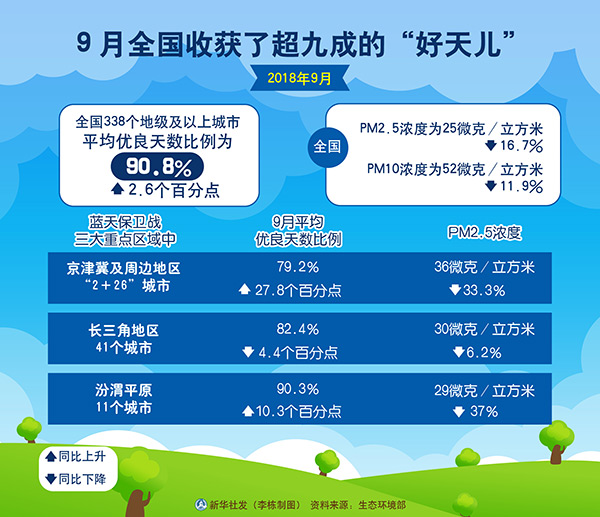 新華社北京10月18日電(記者高敬)生態(tài)環(huán)境部有關(guān)負(fù)責(zé)人18日通報,今年9月,全國338個地級及以上城市平均優(yōu)良天數(shù)比例為90.8%,同比上升2.6個百分點。