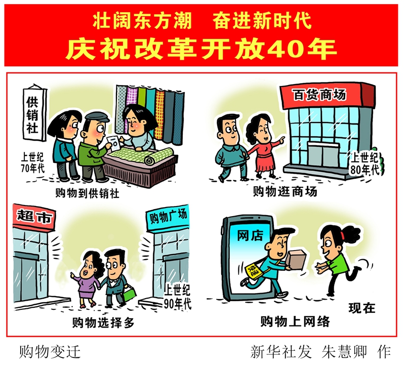 消費:上世紀(jì)70年代,購物到供銷社;上世紀(jì)80年代,購物逛商場;上世紀(jì)90年代,購物選擇多;如今,購物上網(wǎng)絡(luò)。↓↓