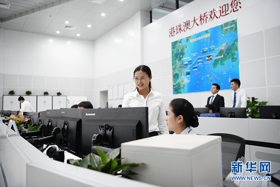 港珠澳大橋管理局營運管理部部長江曉霞(中間站立者)在調(diào)度中心查看大橋車輛通行情況(10月24日攝)。新華社記者梁旭攝