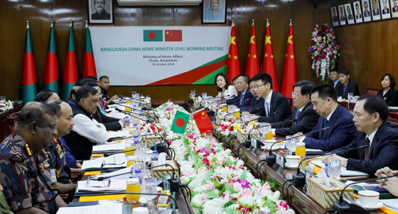 中國(guó)駐孟加拉國(guó)大使張佐,國(guó)務(wù)院副秘書長(zhǎng)孟揚(yáng),公安部副部長(zhǎng)、國(guó)家移民管理局局長(zhǎng)許甘露,孟加拉國(guó)內(nèi)政部常秘烏丁、裘德瑞,警察總監(jiān)帕特瓦瑞參加會(huì)談。(圖:滿博)