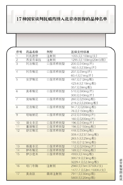 考慮到文件印發(fā)后,各定點醫(yī)療機構(gòu)還需開展藥品采購、配備以及進行醫(yī)院的信息系統(tǒng)升級改造等因素,這17種抗癌藥北京市將從今年11月15日起開始納入醫(yī)保報銷。