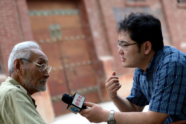 圖為2015年7月,陳晨(右)在陜西省涇陽(yáng)縣采訪抗戰(zhàn)老兵寧西珍。
