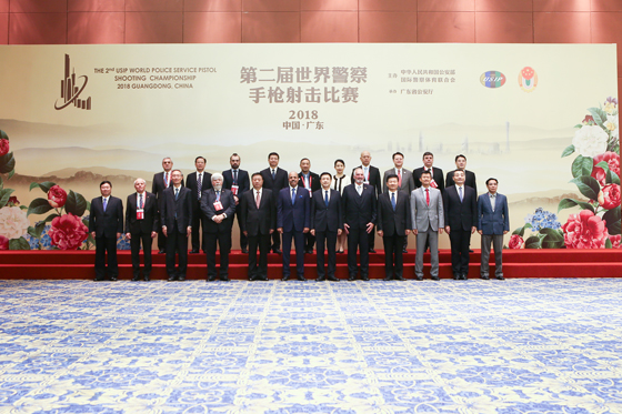 11月13日,公安部常務(wù)副部長、第二屆世界警察手槍射擊比賽組委會名譽(yù)主席王小洪在廣州同來華出席比賽開幕式的國際警察體育聯(lián)合會和各國執(zhí)法部門官員合影。