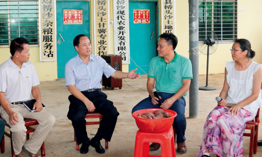海南省委書(shū)記、省人大常委會(huì)主任劉賜貴(左二)在澄邁縣橋頭地瓜種植基地與當(dāng)?shù)馗扇鹤?李英挺攝