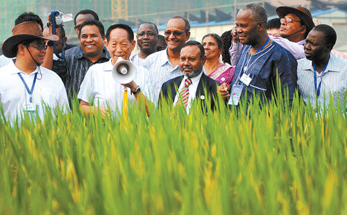 2009年9月,袁隆平帶各國朋友參觀試驗田。新華社發(fā)