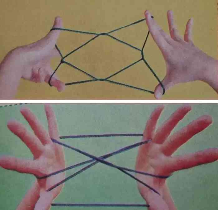 用一根繩子結成繩套,一人以手指編成一種花樣,另一人用手指接過來,翻成另一種花樣,相互交替編翻,直到一方不能再編翻下去為止。這個游戲最大的樂趣在于翻出新花樣,展現(xiàn)自己的聰明才智。