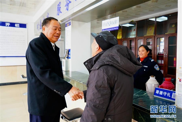12月24日,邱娥國(左)在南昌市筷子巷派出所向一位前來辦事的居民問好。 新華社記者 胡晨歡 攝