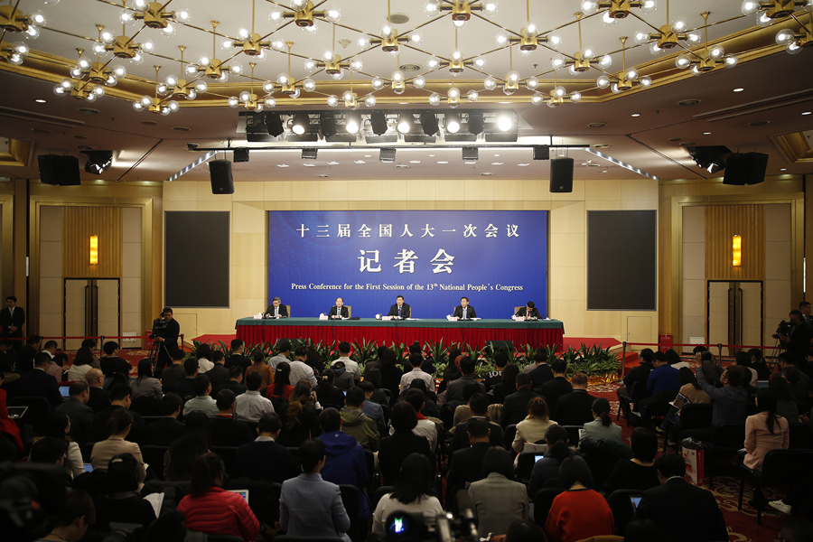 十三屆全國(guó)人大一次會(huì)議新聞中心3月6日上午10時(shí)在梅地亞中心多功能廳舉行記者會(huì),邀請(qǐng)國(guó)家發(fā)展和改革委員會(huì)主任何立峰、副主任張勇、副主任寧吉喆就“創(chuàng)新和完善宏觀調(diào)控,推動(dòng)高質(zhì)量發(fā)展”相關(guān)問題回答中外記者提問。圖為記者會(huì)現(xiàn)場(chǎng)。 新華網(wǎng)/中國(guó)政府網(wǎng) 陳杰 攝