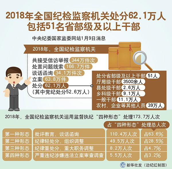 圖表:2018年全國紀(jì)檢監(jiān)察機(jī)關(guān)處分62.1萬人 包括51名省部級(jí)及以上干部 新華社發(fā) 邊紀(jì)紅 制圖