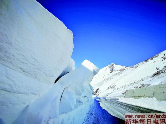 艾肯達(dá)坂上公路邊堆起的高大的雪墻。李曉玲攝