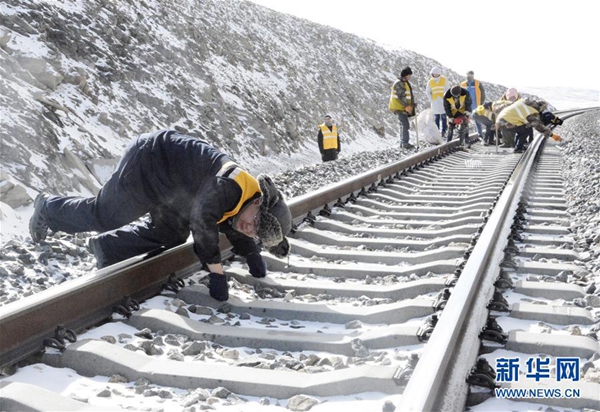 青藏鐵路格爾木工務(wù)段望昆線路養(yǎng)護(hù)車間副主任于本蕃(前)跪在鐵路上對(duì)已完成檢修的鐵軌進(jìn)行復(fù)檢(1月11日攝)。 新華社發(fā)(王浡 攝)