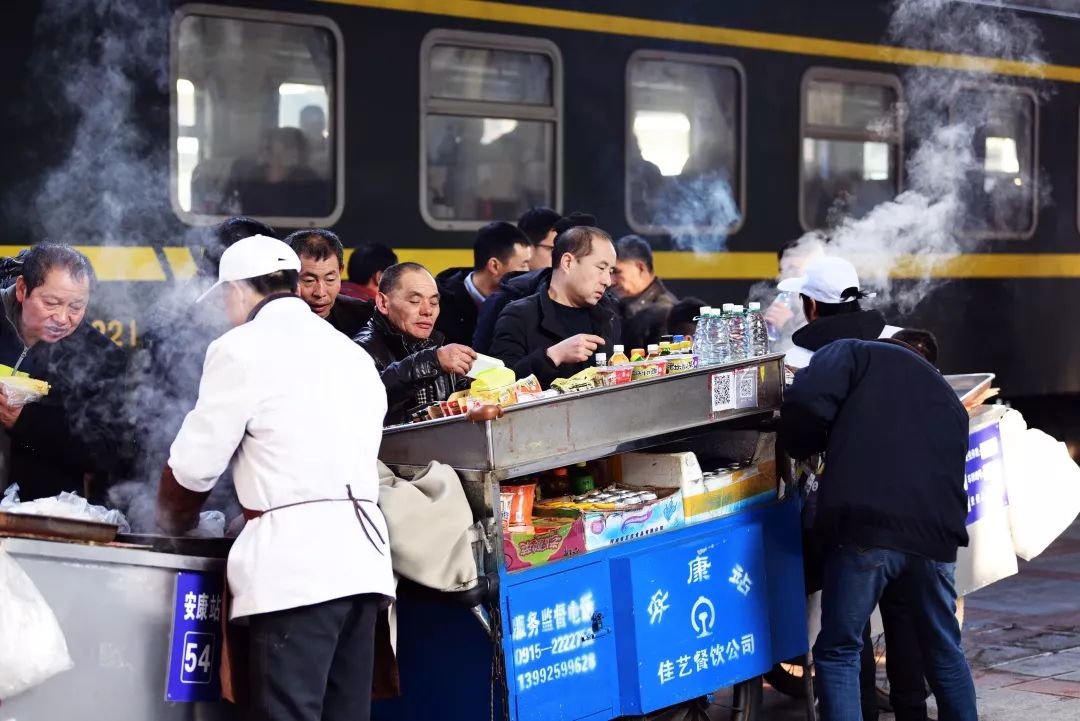 2019-01-22,陜西省安康市。呼和浩特至昆明K691次列車到達安康站,旅客被站臺售賣的美食所吸引。作者:玩家