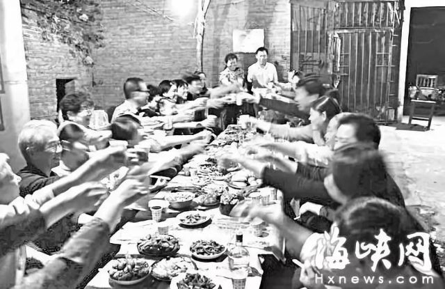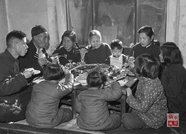 ↑1953年,天津市漢沽區(qū)蘆臺王德鑄(左一)一家吃團圓飯。