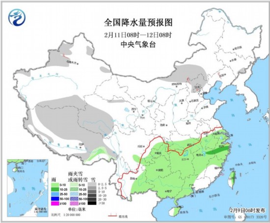 2月11日08時(shí)至12日08時(shí),內(nèi)蒙古中部、新疆伊犁河谷、南疆盆地、青海南部和西部、西藏北部和東部、河北北部和北京等地的部分地區(qū)有小雪或雨夾雪。云南東部、江淮、江漢、江南大部、西南地區(qū)東部、華南大部和臺(tái)灣島等地部分地區(qū)有小雨,局地有中雨。遼寧中部、新疆沿天山地區(qū)、河北北部和浙江北部等地部分地區(qū)有4~5級(jí)風(fēng)(見圖4)。