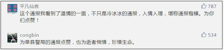 撰寫這份通報的莘縣公安局宣傳科室相關(guān)負責(zé)人稱,通報發(fā)布后,他們收獲了很多暖心留言?!捌鋵嵨覀冞@樣寫通報的原因很簡單,就是站在死者家屬的角度、立場去考慮這個事情?!?/p>