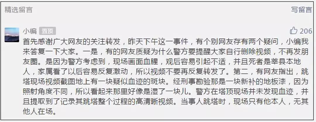 “我們就在通報的基礎(chǔ)上,通過留言進行了辟謠和提醒?!本奖硎?,就此事有個別網(wǎng)友存有兩個疑問:一是,質(zhì)疑為什么警方要提醒大家自行刪除視頻。警方解釋,現(xiàn)場畫面血腥,觀后容易引起不適,并且死者是莘縣本地人,家屬看了以后容易反復(fù)激動。二是,網(wǎng)友指出,跳塔現(xiàn)場視頻截圖地上有一塊疑似血跡的斑塊。經(jīng)刑事勘驗?zāi)鞘且粔K新補的地板漆,因照射角度不同,所以看起來那里好像是濕了一塊兒。警方在現(xiàn)場并未發(fā)現(xiàn)血跡,此外,當事人跳塔時,現(xiàn)場只有他本人。
