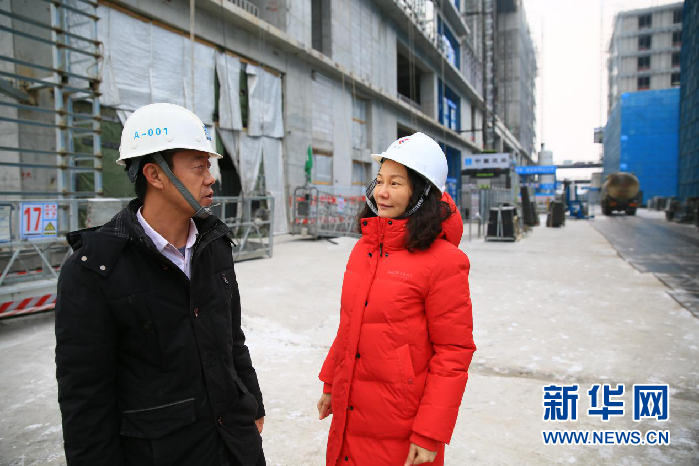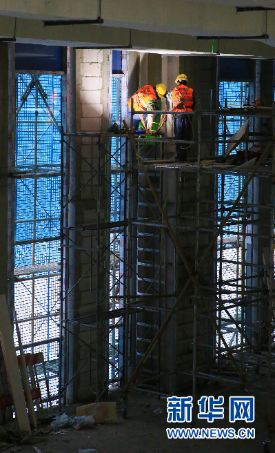 圖片說明:龍雪波向記者介紹,離竣工還剩136天,工人們以飽滿的精神努力工作。攝影:新華網(wǎng)錢春弦