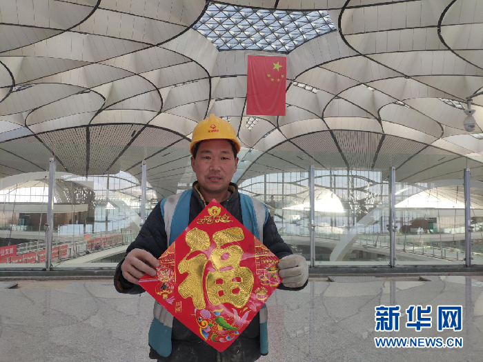 圖片說明:大興機(jī)場(chǎng)航站樓春節(jié)期間值守的工人舉起了“福”字。 攝影:新華網(wǎng)錢春弦