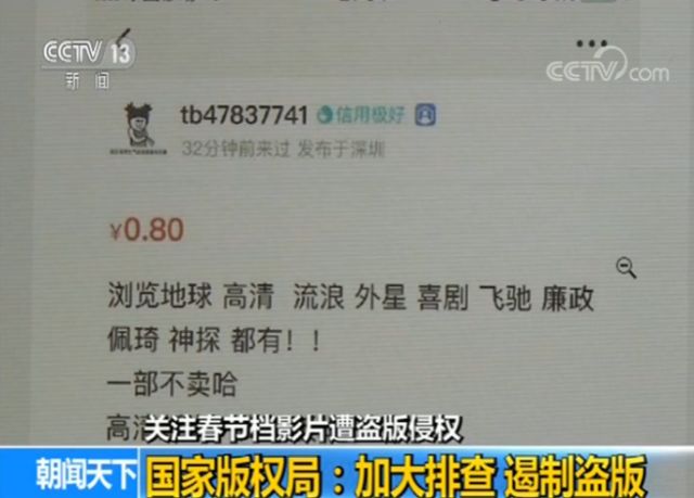 大年初一,多部不同類型和題材的國(guó)產(chǎn)影片集中上映,吸引了不少觀眾走進(jìn)影院。以電影《流浪地球》為例,憑借觀眾口碑,截至15日下午,該片票房已突破32億元,刷新了國(guó)產(chǎn)電影的多項(xiàng)票房紀(jì)錄。不過(guò)《流浪地球》上映沒(méi)幾天,該片的盜版資源就開(kāi)始通過(guò)微信朋友圈和微博等渠道在互聯(lián)網(wǎng)上傳播。甚至有人通過(guò)微商公然叫賣包含《流浪地球》在內(nèi)的多部院線影片的盜版資源,不僅聲稱畫質(zhì)“高清完整”,單部影片售價(jià)低至1元不到,打包購(gòu)買還能享受優(yōu)惠。