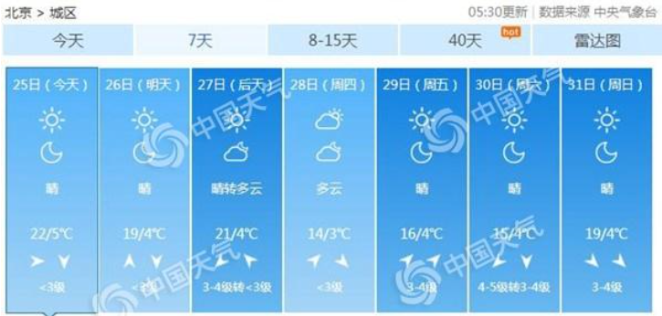 預計,本周(25-31日)北京天氣以晴為主,氣溫多起伏,其中今天最高氣溫22℃,周四將降至14℃,乍暖還寒,公眾還需關(guān)注臨近預報,根據(jù)天氣適當增減衣物。