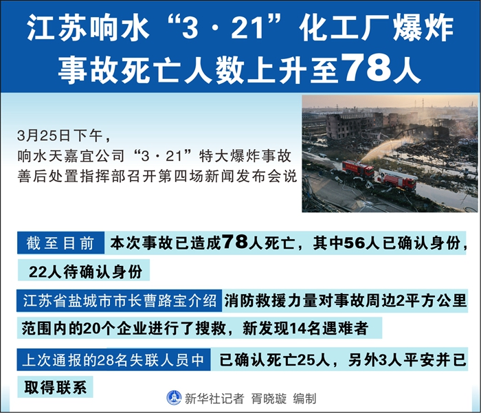 新華社響水3月25日電(記者朱國亮)25日下午,響水天嘉宜公司“3·21”特大爆炸事故善后處置指揮部召開第四場新聞發(fā)布會(huì)說,截至目前,本次事故死亡人數(shù)上升至78人。