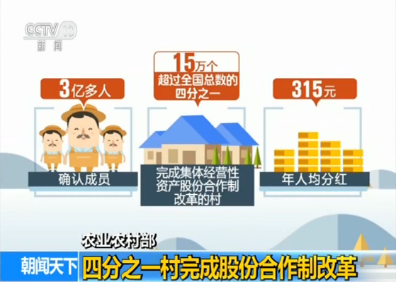 最新數(shù)據(jù)顯示,目前,全國農(nóng)村集體經(jīng)濟組織年收入達(dá)到4627億元,年經(jīng)營收益超過5萬元的村接近30%。其中,完成集體經(jīng)營性資產(chǎn)股份合作制改革的村有15萬個,超過全國總數(shù)的四分之一,確認(rèn)成員有3億多人,年人均分紅315元。