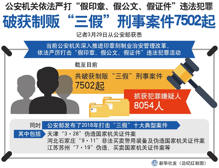 新華社北京3月29日電(記者丁小溪)記者29日從公安部獲悉,當(dāng)前公安機(jī)關(guān)深入推進(jìn)印章刻制業(yè)治安管理改革,依法嚴(yán)厲打擊“假印章、假公文、假證件”違法犯罪活動(dòng),截至目前,共破獲制販“三假”刑事案件7502起,抓獲犯罪嫌疑人8054人。