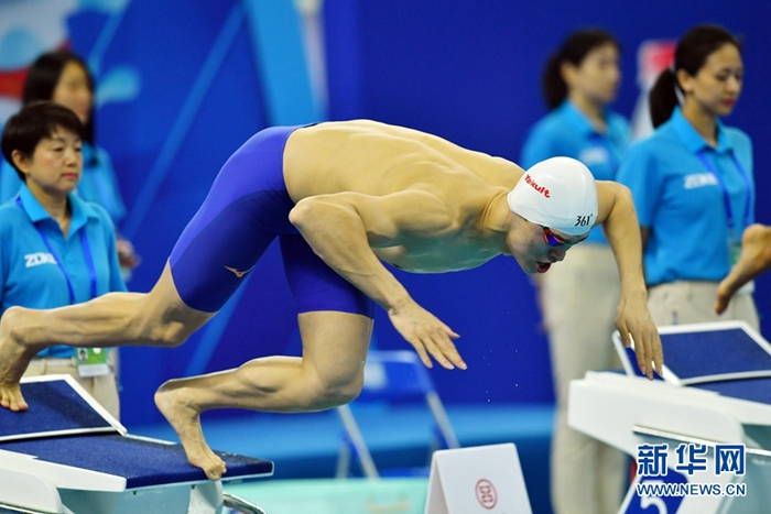 3月27日,浙江隊(duì)選手孫楊在比賽中出發(fā)。當(dāng)日,在青島舉行的2019年全國(guó)游泳冠軍賽暨世錦賽選拔賽男子800米自由泳決賽中,浙江隊(duì)選手孫楊以7分48秒03的成績(jī)獲得冠軍。 新華社記者朱崢攝