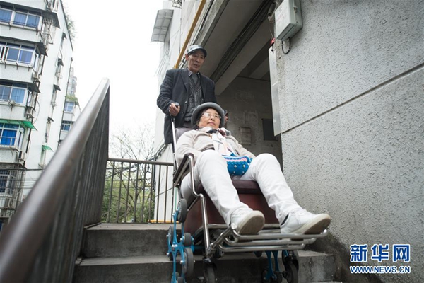 4月11日,在桐廬縣桐君街道,老伴陳洪明推著吳素環(huán)下樓前往中國盲文圖書館桐廬縣支館為視障人士解說電影《可可西里》。新華社記者 翁忻旸 攝
