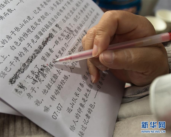 4月11日,吳素環(huán)在中國盲文圖書館桐廬縣支館修改電影《可可西里》的解說稿。新華社記者 翁忻旸 攝
