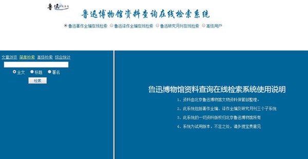 澎湃新聞?dòng)浾卟樵儼l(fā)現(xiàn),網(wǎng)友提到的“魯迅說過的話”檢索系統(tǒng)其實(shí)正確名稱為“魯迅博物館資料查詢?cè)诰€檢測(cè)系統(tǒng)”(網(wǎng)址:http://cx.luxunmuseum.com.cn/)。根據(jù)官方介紹,該系統(tǒng)由北京魯迅博物館文物資料保管部整理,包括魯迅著作全編、譯作全編及研究月刊三個(gè)子系統(tǒng),而系統(tǒng)一切資料版權(quán)歸北京魯迅博物館所有。