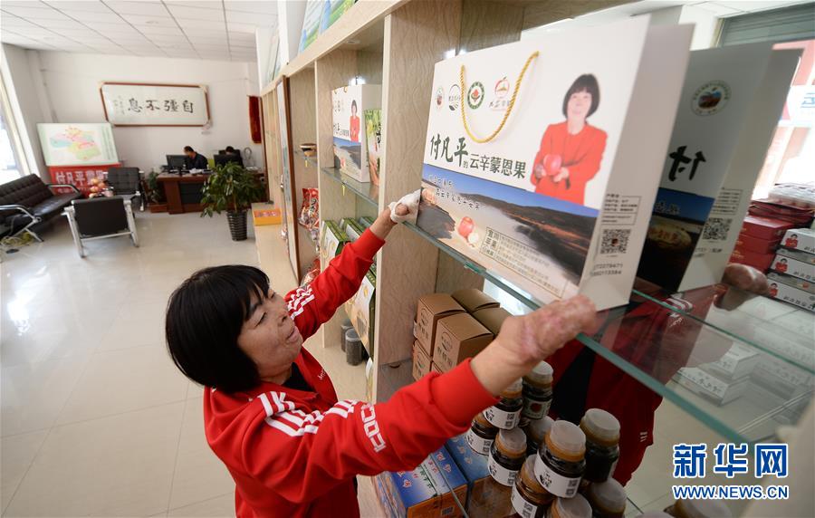 凡平在位于陜西宜川縣城自己公司的實(shí)體店里整理展示柜(2018年10月16日攝)。新華社記者 劉瀟 攝