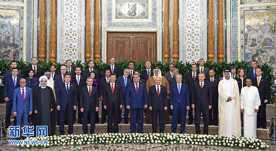 6月15日,亞洲相互協(xié)作與信任措施會議第五次峰會在塔吉克斯坦首都杜尚別舉行。國家主席習近平出席峰會并發(fā)表重要講話。這是出席會議的亞信成員國領導人或代表,觀察員國代表以及有關國際和地區(qū)組織代表集體合影。 新華社記者 張領 攝
