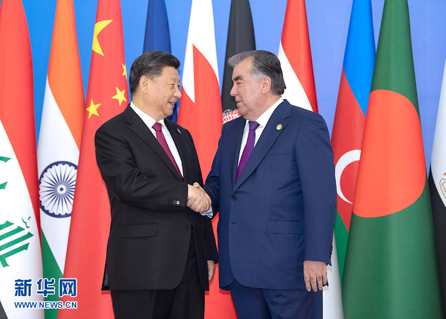 6月15日,亞洲相互協(xié)作與信任措施會議第五次峰會在塔吉克斯坦首都杜尚別舉行。國家主席習近平出席峰會并發(fā)表重要講話。這是習近平抵達納烏魯茲宮迎賓廳,受到塔吉克斯坦總統(tǒng)拉赫蒙熱情迎接。 新華社記者 沙達提 攝
