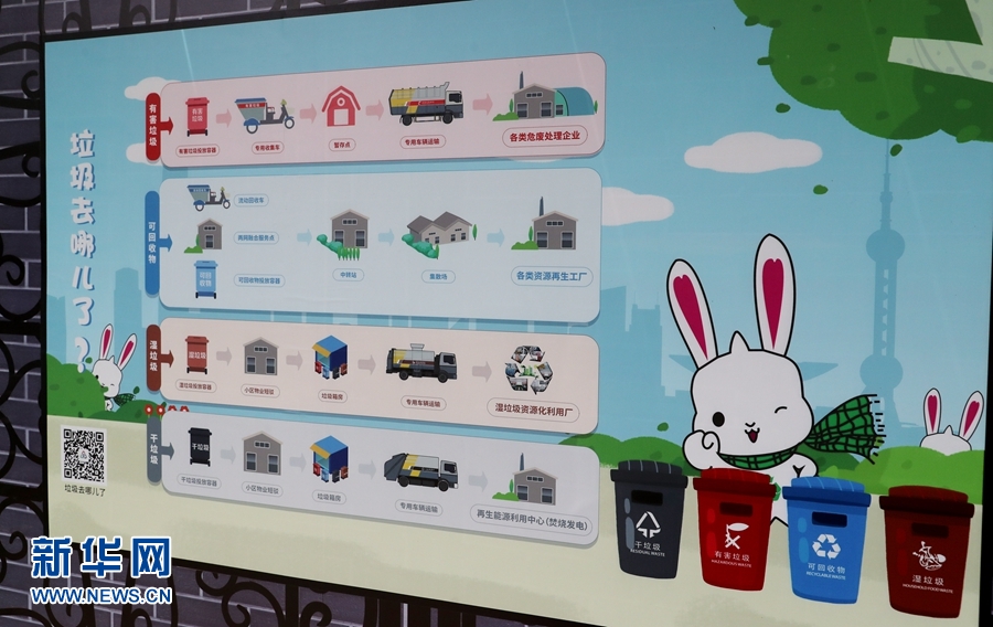 在虹口區(qū)嘉興路街道“宇泰景苑”小區(qū)內(nèi),小區(qū)垃圾房外的裝飾墻上對分類后不同垃圾的去向進(jìn)行詳解(6月24日攝)。 新華社記者 方喆 攝